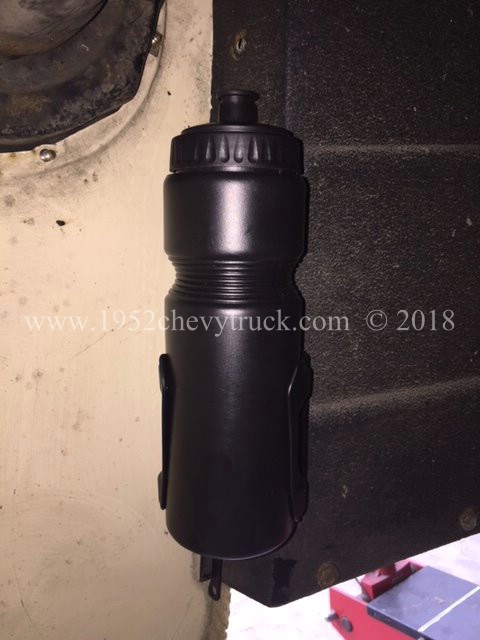 between the hood and the firewall. The tank is easily refilled with a detachable bottle. No holes are drilled